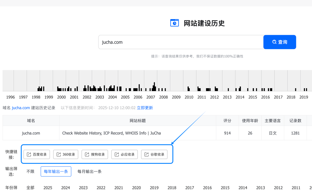 2、「建站歷史詳情頁面」增加:百度收錄,360收錄,搜狗收錄,必應收錄,谷歌收錄的快捷鏈接。